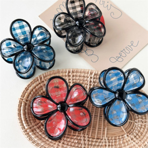 後頭部用のチェック柄フラワーグリッパー、高級シャーククリップ、甘い気質、ポニーテールクリップ、ヘアアクセサリー