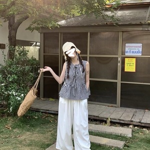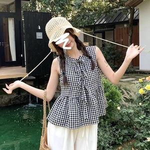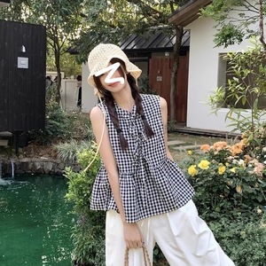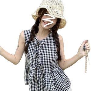 甘い年齢を減らすチェック柄レースアップリボンノースリーブシャツ 2025 夏の新しいルーズカジュアル多用途トップ女性用