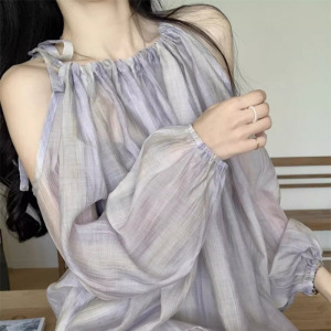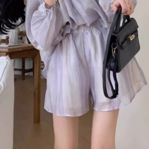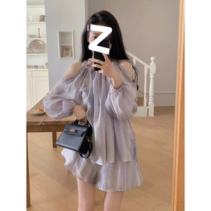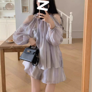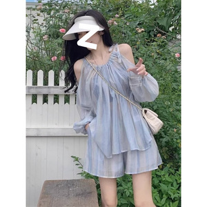 フレンチレイジースタイルオフショルダー長袖日焼け止めトップとショーツツーピース夏ルーズお腹カバーサスペンダースーツ卸売