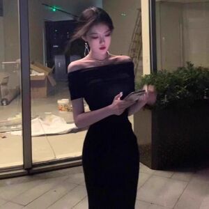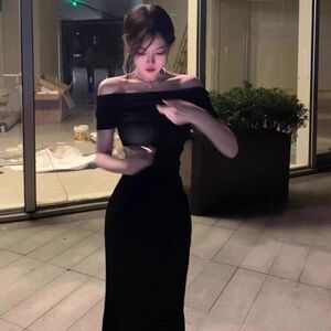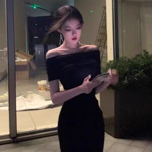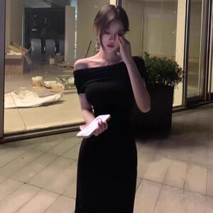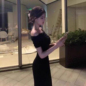 フレンチスタイルの新しいミドル丈スカート、スリムな半袖、秋の黒のドレス、スカート、気質、スリムな夏