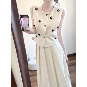 フランスの高級スタイルセレブライトラグジュアリーノースリーブベストフラワートップレディースプリーツスカートスーツ