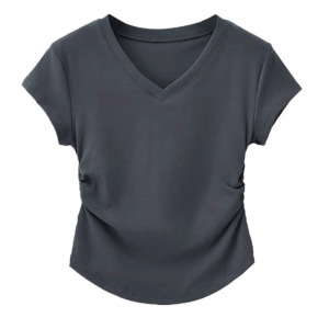 奶蓝色V领少女感正肩T恤夏卡腰褶皱显瘦上衣女小众辣妹短袖跨