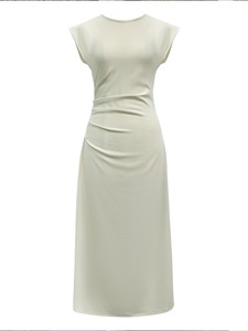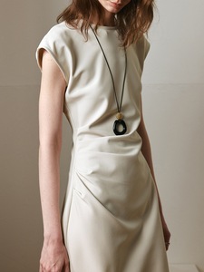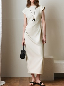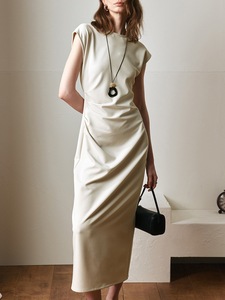 气质宽肩圆领无袖连衣裙女设计感压褶高腰中长款裙子夏