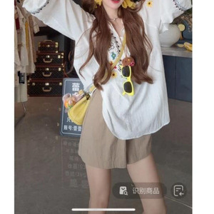 白いトップス+茶色のショートパンツ