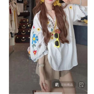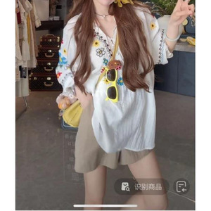 ヘビーデューティーフラワー刺繍薄手クール/リネンコットンドールシャツ+ショーツセット