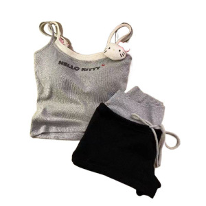 キティ猫偽ツーピースサスペンダーパジャマ女性の夏着用可能な胸パッドベストショーツホーム服セット