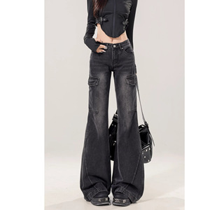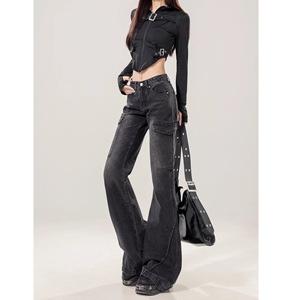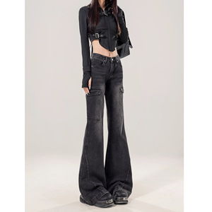 黑灰美式工装微喇牛仔裤女2025春季新款高腰修身显瘦喇叭拖地裤子