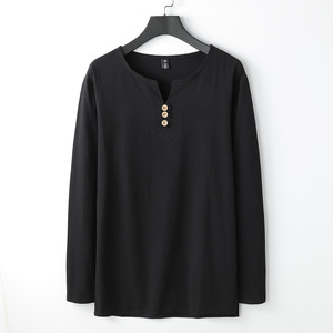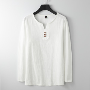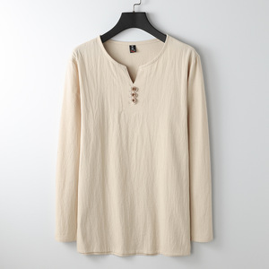 リネン長袖TシャツメンズVネック夏ゆったり薄手復活中国風紳士服綿麻文学メンズTシャツ