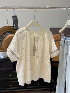 25夏デザインエスニック風刺繍レースアップタッセルペンダント半袖シャツレディースゆったりカバー万能トップス