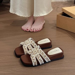 クロスパールワンラインサンダル女性用 2025 夏の新しいスタイルの女性用スリッパフレンチウェッジサンダル