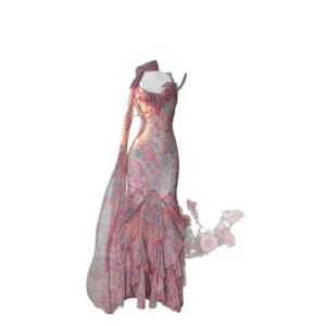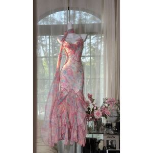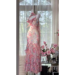 フレンチニッチデザインの不規則な花柄のフリルドレス、女性用の新しい夏のスタイルのホルターネックロングドレス