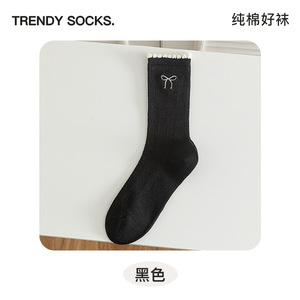 袜子女夏薄款网眼纯棉中筒袜蝴蝶结刺绣花边女袜防臭堆堆袜jk袜子