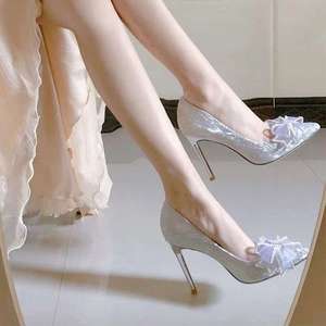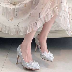 法式水晶鞋2025春秋新款银色婚鞋水钻蝴蝶结尖头高跟鞋女细跟单鞋