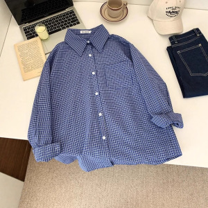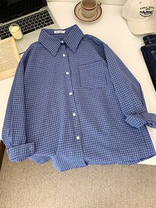 蓝色格子长袖衬衫外套上衣女早秋复古慵懒风宽松休闲显瘦格纹衬衣