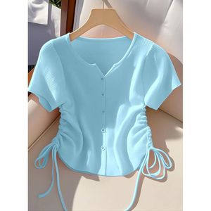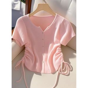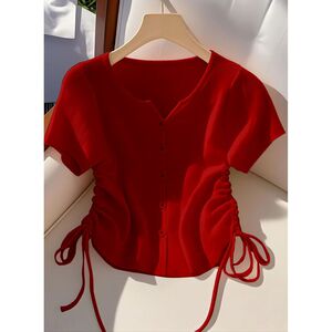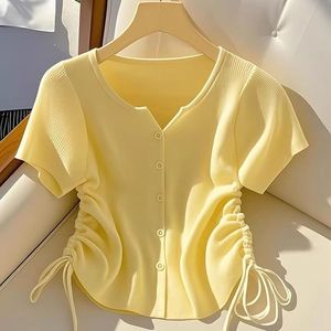超見栄えの良い黄色の巾着半袖アイスシルクショートニットカーディガンTシャツレディース夏シック韓国トップストレンディイン