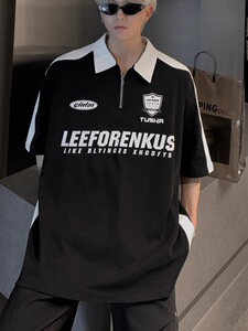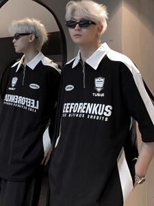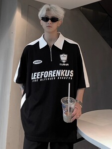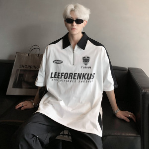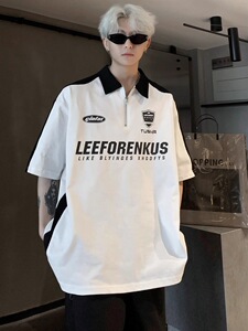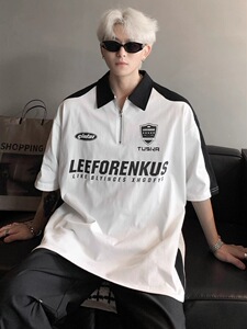 150kg 大きいサイズメンズハーフジップポロシャツ半袖 Tシャツ男性と女性の夏のハイストリートハンサムアメリカンレーシングスーツ