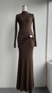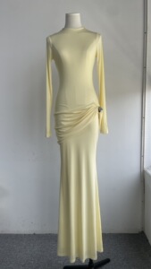 スポットニッチデザイン新しいソリッドカラースリムフィットシンプルなプリーツ長袖ドレスヒップカバーフロアレングスプリーツフィッシュテールスカート