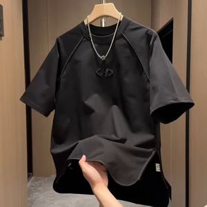 夏ジッパー刺繍ラウンドネック半袖 Tシャツメンズトレンディな多用途ソリッドカラートップカップルカジュアルインルーズ半袖