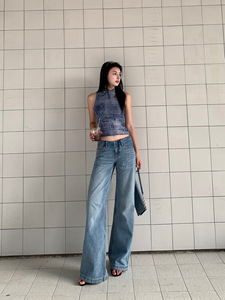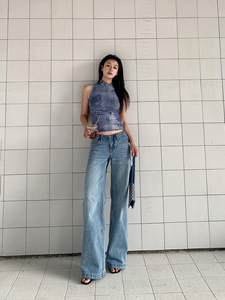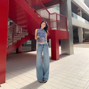 夏用ウエストレスクールテンセルレトロウォッシュローウエストストレートジーンズ女性用