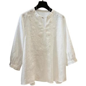 高級リネンヘビーエンゲージメント刺繍七分袖シャツレディース夏薄手フレンチスタイルシャツ超見栄えの良いトップ