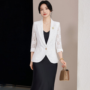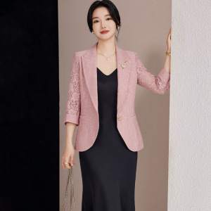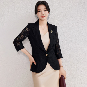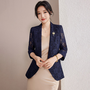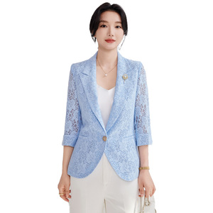 浅蓝色七分袖西装外套女夏季薄款2025新款休闲蕾丝镂空小西服上衣