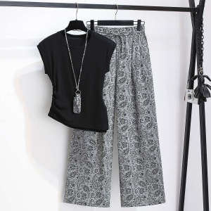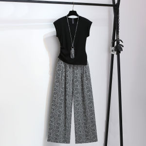 女性のための黒のテンセル半袖Tシャツとワイドレッグパンツ2025新しい夏のスタイルのハイエンド痩身ツーピーススーツ