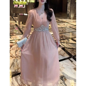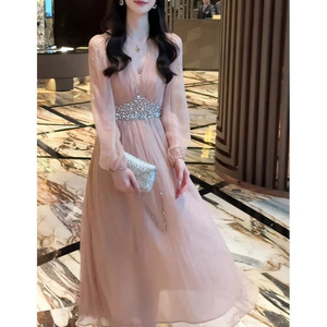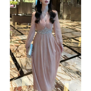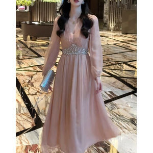 フランスのリッチガールスタイルのヘビーデューティーダイヤモンドドレス女性のための2025春の新しいハイエンドデザインVネックロングスカートトレンディ