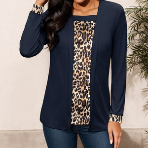 2025 新在庫クロスボーダー外国貿易ヨーロッパとアメリカの服アマゾン売れ筋ヒョウ柄フェイクツーピース長袖トップ