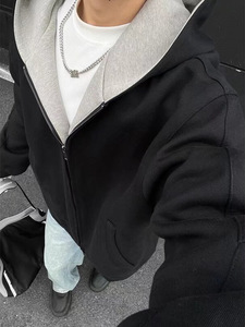 ダブルジッパーカーディガンスウェットシャツボーイズトレンディな春と秋のハイエンドシルエットアメリカンハイストリートヘビーハードフード付きジャケット