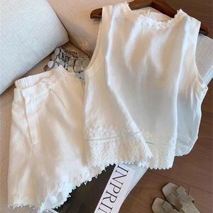 D6X ファッショナブルなハイエンドシャツトップショーツスーツ夏の女性の白いレース刺繍ベストのセット