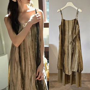 新しい中国風のレトロな絞り染めサスペンダードレス 2025 春と夏の新しい緩い休暇旅行小柄な女性のためのロングスカート