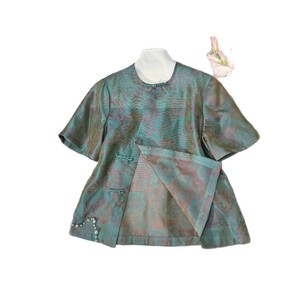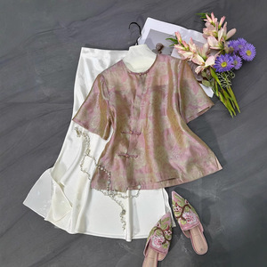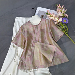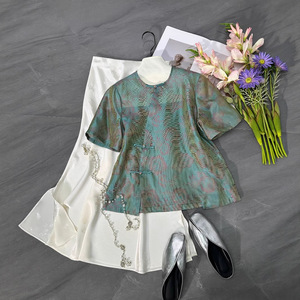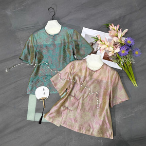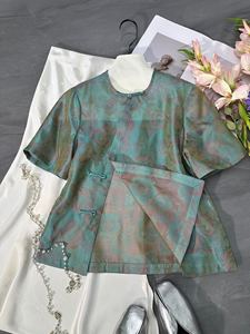 2025 夏の新中国風の光沢のある錦織手作りボタン付きトップス端桑シルク 2 色牡丹シャツ半袖