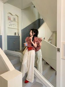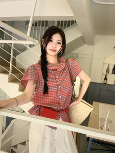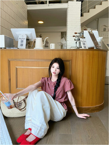 赤いチェック柄半袖シャツベビードールカラートップ婦人服夏シックな中空カジュアルパンツストレートパンツ 2 点セット