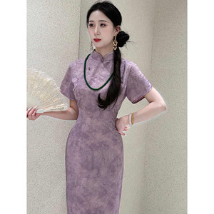 絵画の女性の中国風の両面カラーパープル中国風チャイナドレス紫の花