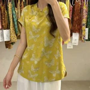 新しい中国風の女性の夏の新しいルーズでスリムなハイエンドジャカードサテンレトロな中国風のボタン付きトップ半袖