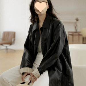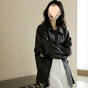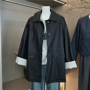 女性のための黒の甘くてクールなスタイルのレザージャケット春の新しいレトロなストライプのコントラストカラーデザインミッドレングスウインドブレーカートレンディ