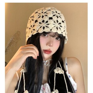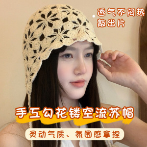 春と夏の女性用の手編み中空帽子、エスニックスタイルのタッセルつば付き帽子、通気性があり顔が見える小さなニットプルオーバー帽子