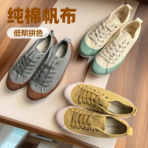 レディースシューズ、加硫靴、レディースシューズ、ウォッシュ加工、ダメージ加工、レトロコットン、ローカット、カラーブロックキャンバスシューズ、カジュアルトレンド