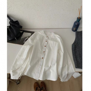 綿香港スタイルのファッショナブルなダブル前立て小さなスタンドカラー長袖シャツ年齢軽減トップ 2025 秋の新しいルーズシャツ