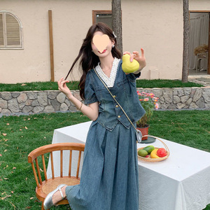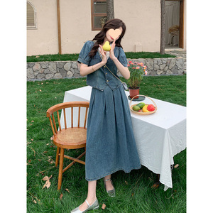 韩系穿搭牛仔套装裙女夏季2025年新款泡泡袖领上衣半身裙两件套