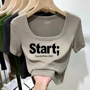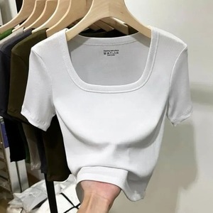 2025年夏新作女性用右肩半袖Tシャツ、ピュアでシック、甘くてスパイシー、鎖骨露出スクエアカラートップ、スレッドTシャツ