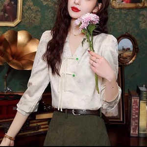 中国風の春と夏の薄いレトロなバックル V ネックシャツと馬面スカート新しい中国風の女性のシャツ