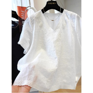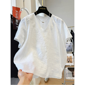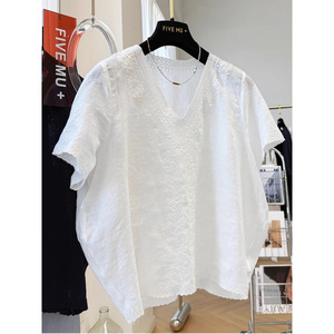 女性のための重厚な刺繍Vネックコットンとリネンの半袖シャツ、新しい夏のスタイル、ゆったりしていて超見栄えの良いフレンチトップ、ユニークなシャツ