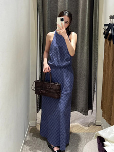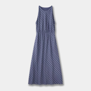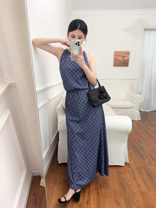 MD アイランドリゾート風フレンチレトロチェック柄ホルターネックノースリーブワンピースウエストロングスカート 06630850430