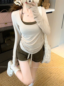 カジュアルスーツ レイジースタイル Uネック 長袖 Tシャツ カバーアップ ホルターベスト レディース 夏 ハイウエスト ワイドレッグ ショーツ 3点セット