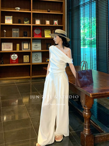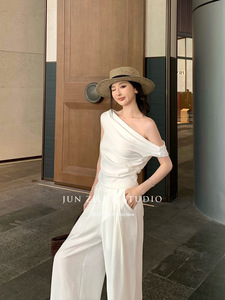 オールドマネースタイルの白いスーツの女性の夏の休暇スタイルの斜め肩半袖トップハイウエストスリムワイドレッグカジュアルパンツ