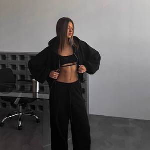 欧美女士休闲套装纯色长袖拉链开衫抽绳连帽卫衣运动松紧裤二件套
