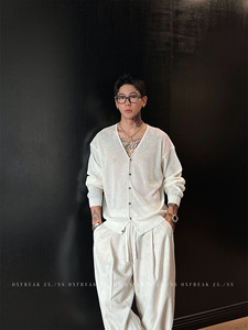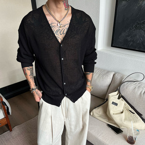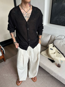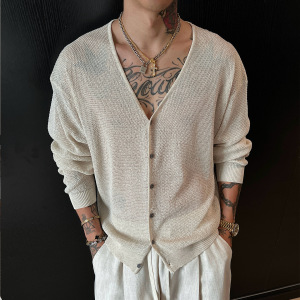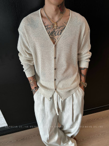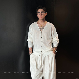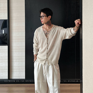 OXFREAK「テンセルリネン中空デザイン」オールドマネースタイルニットカーディガンメンズ夏薄手Vネックジャケット