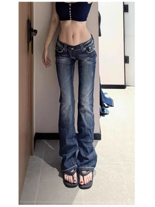 美式高街重工贴钻刺绣低腰牛仔裤子女y2k千禧辣妹修身显瘦拖地裤