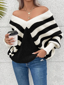 ヨーロッパとアメリカのプラスサイズの外国貿易プラスサイズのストライプのコントラストカラーのVネック長袖セータートップクロスボーダー